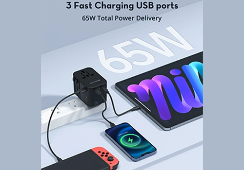 3 Fast charging USB ports The compact and powerful charger can fast charge 3 devices delivering a total of 65 Watts power.