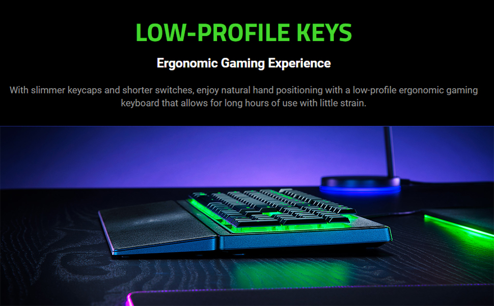 Low-Profile Keys: With slimmer keycaps and shorter switches, enjoy natural hand positioning that allows for long hours of use with little strain