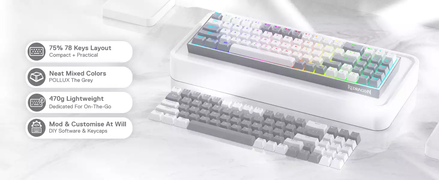 Product NameRedragon K628 Pollux 75% Wired RGB Gaming Keyboard Red Switch - White & Grey