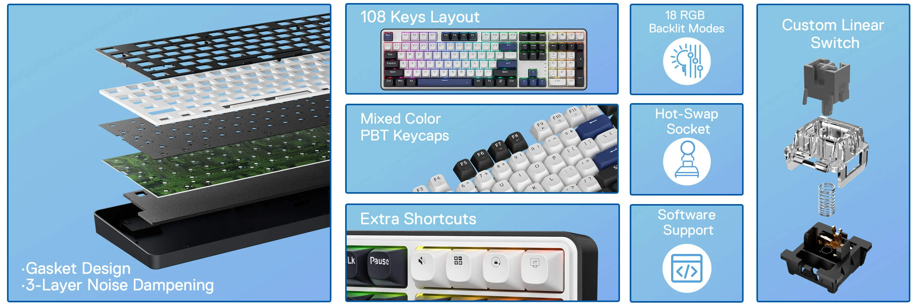 Equipped with 3.5mm PO foam, IXPE switch foam, bottom socket foam along with the silicone gasket. Significantly reduce the hollow noise, creating dampened and ultra-clean typing acoustics, making each keystroke satisfying and comfortable.