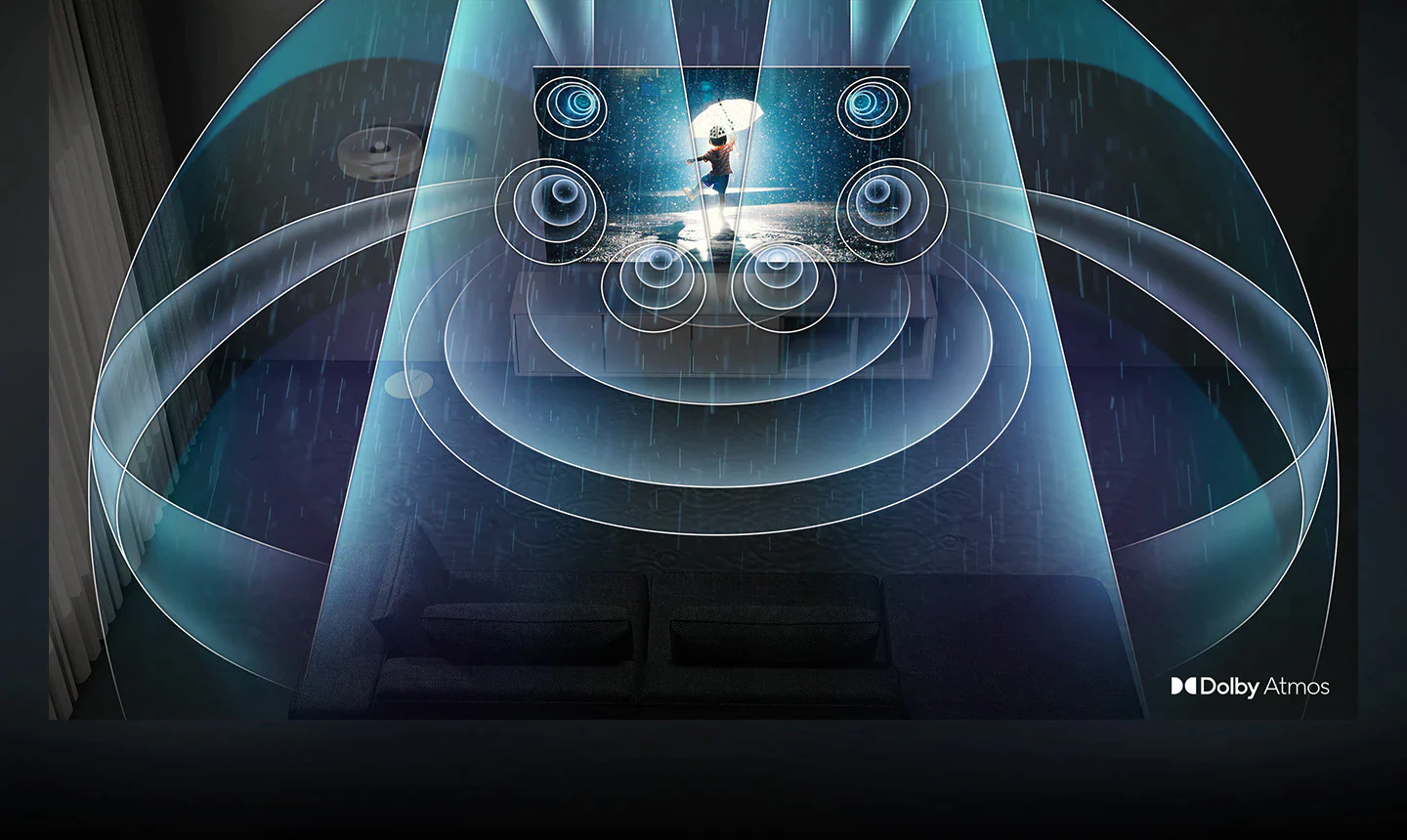 Dolby Atmos experience with top channel speakers Dolby Atmos®Samsung's new top channel speakers deliver a next level Dolby Atmos experience that will immerse gamers inside the action with multi dimensional sound.