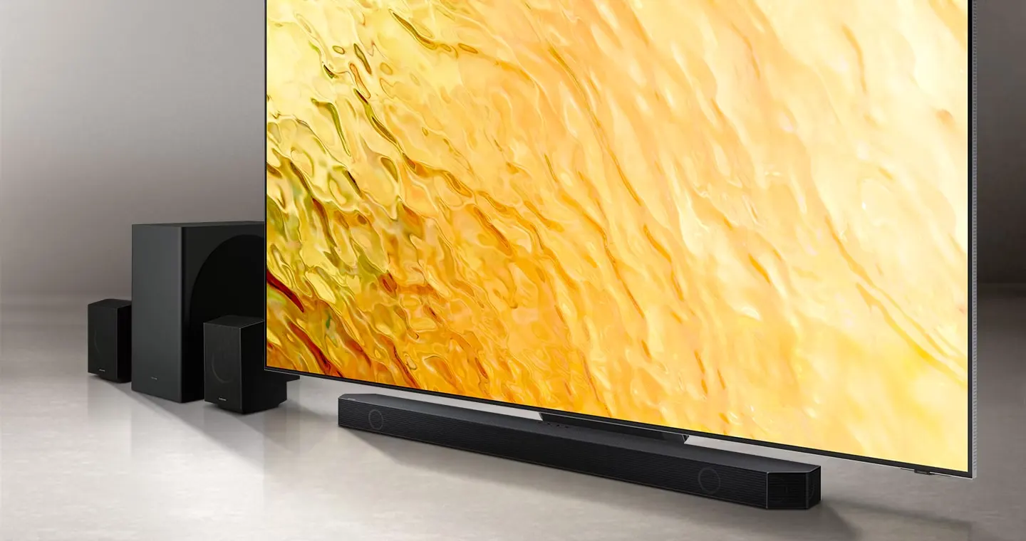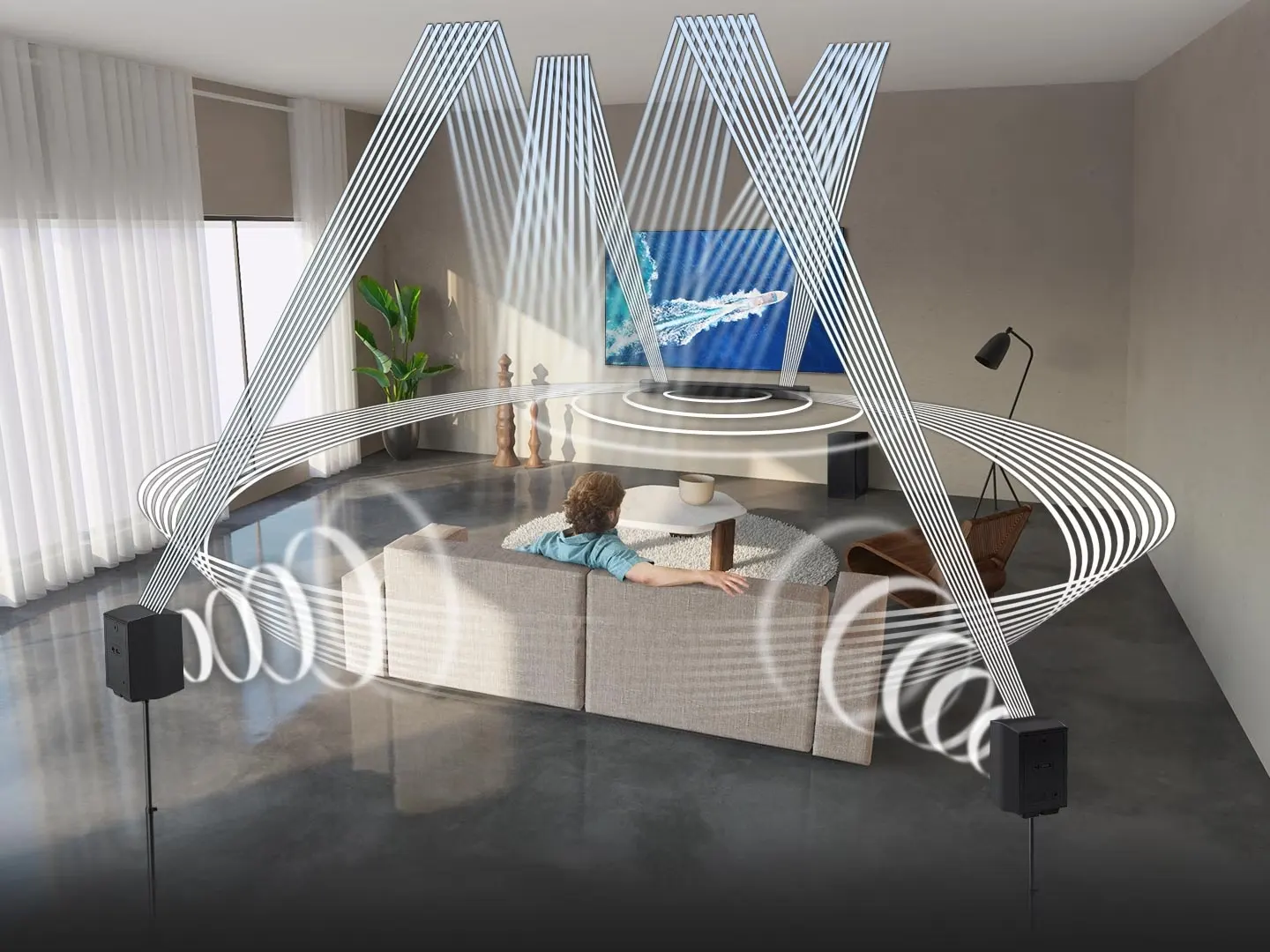 The soundbar's 9 front and surround channels, 1 subwoofer channel, and 4 up-firing channels envelope you in sound. With newly added rear speakers, sound travels and reflects off of the ceiling to enhance your surround sound experience — a great match for your QLED TV.