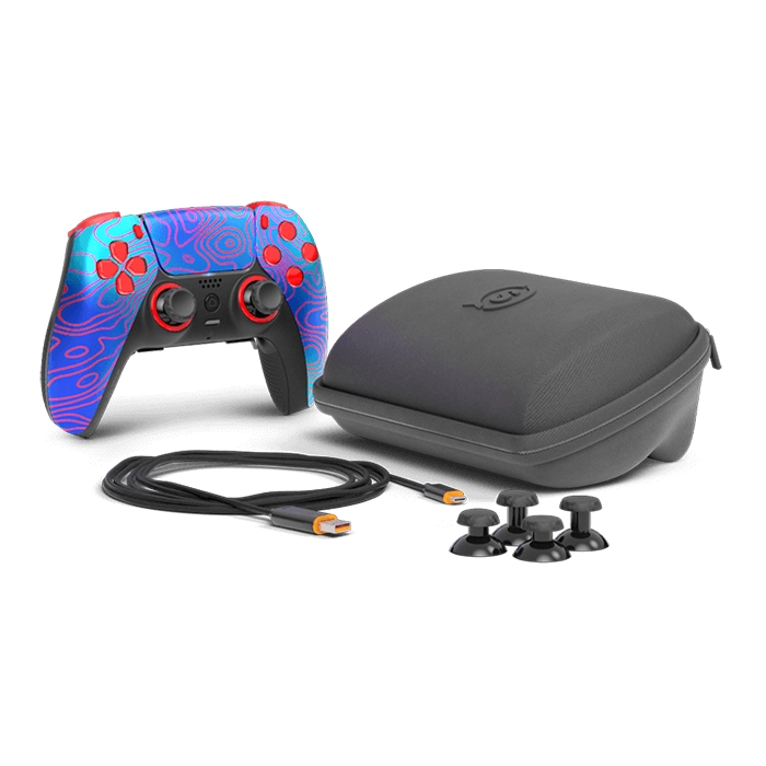 The Reflex comes standard with a black universal protection case, a 6-foot USB-C cable, 2 extra tall domed thumbsticks, and 2 extra short domed thumbsticks.