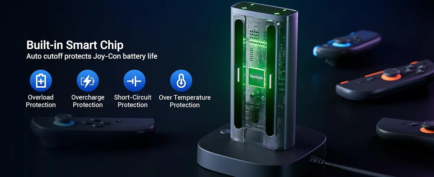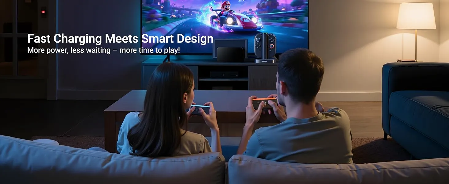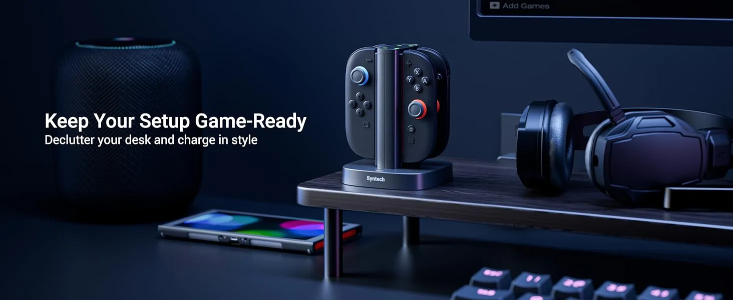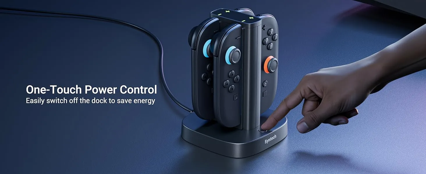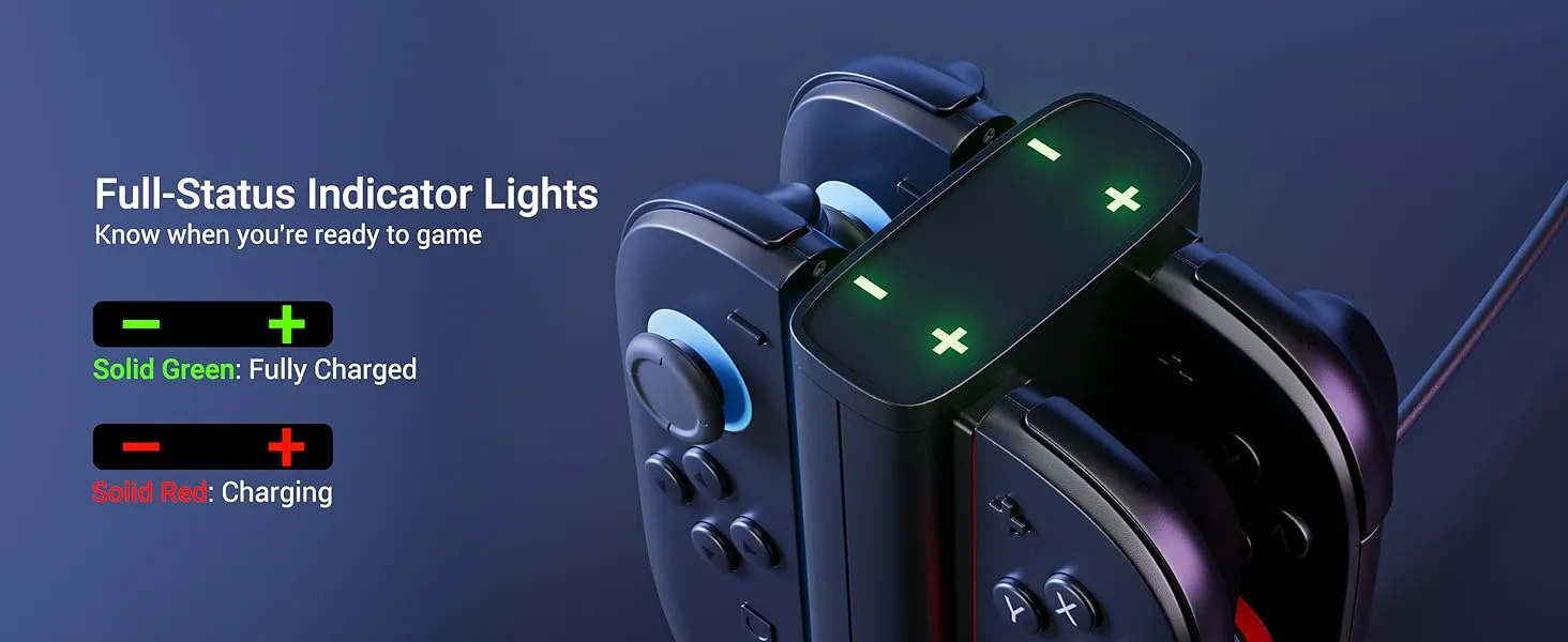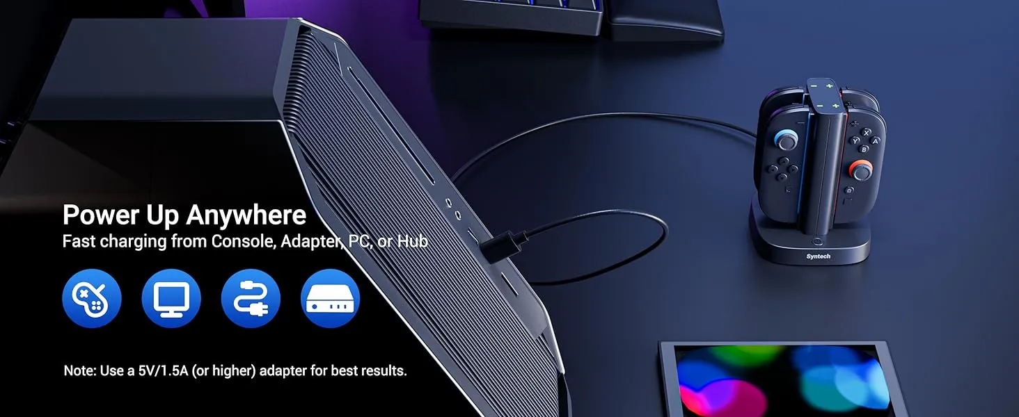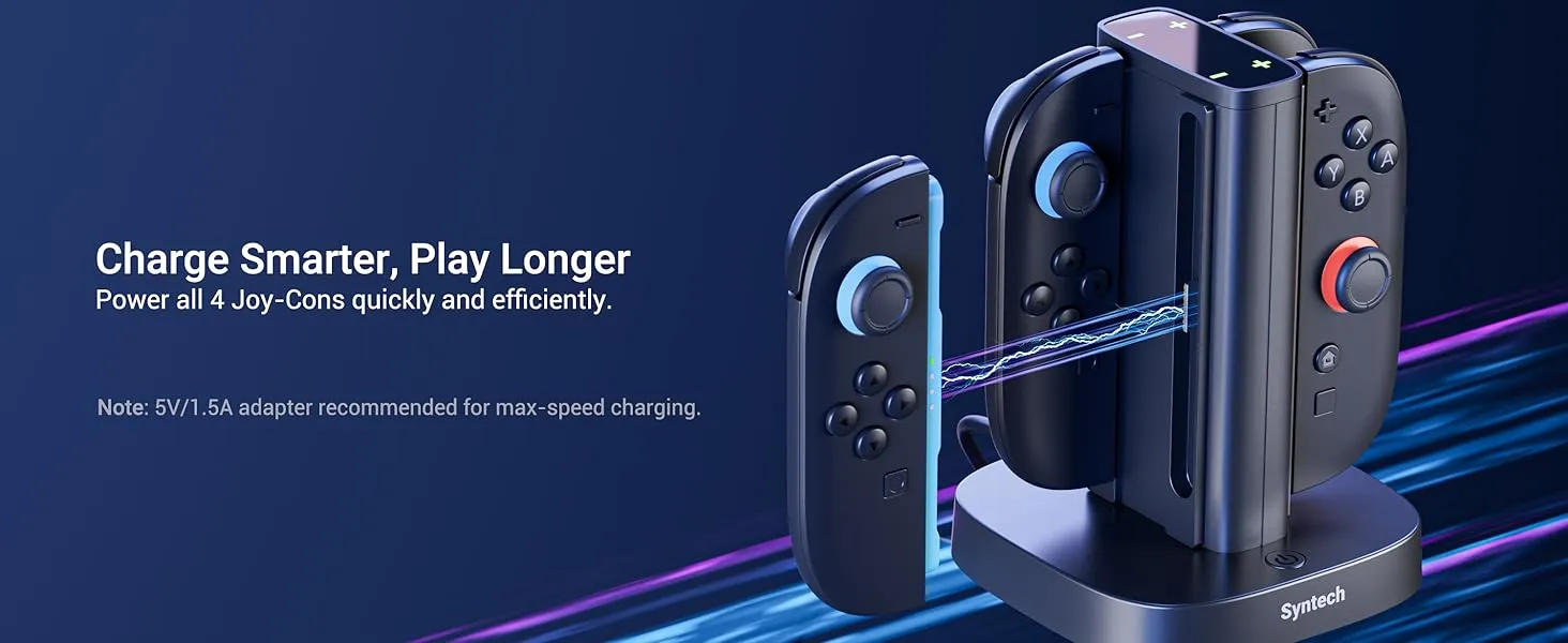 Fast Charging for 4 Joy-Cons Charge up to 4 JoyCon controllers at once with individual circuits for full-speed, efficient power delivery. Built-in USB-A cable offers versatile connectivity with your console, power bank, or PC. (JoyCons not included)