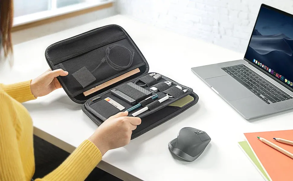 Triple-layer design gives spacious storage to store iPad Pro/Air with smart/ Bluetooth keyboard, while the extra mesh pockets and elasticized segments provide the best flexibility for iPad pencil, power bank, USB cord, SD cards, hub, etc. (Note: The Standard version won't store the iPad Charger & Bluetooth keyboard)