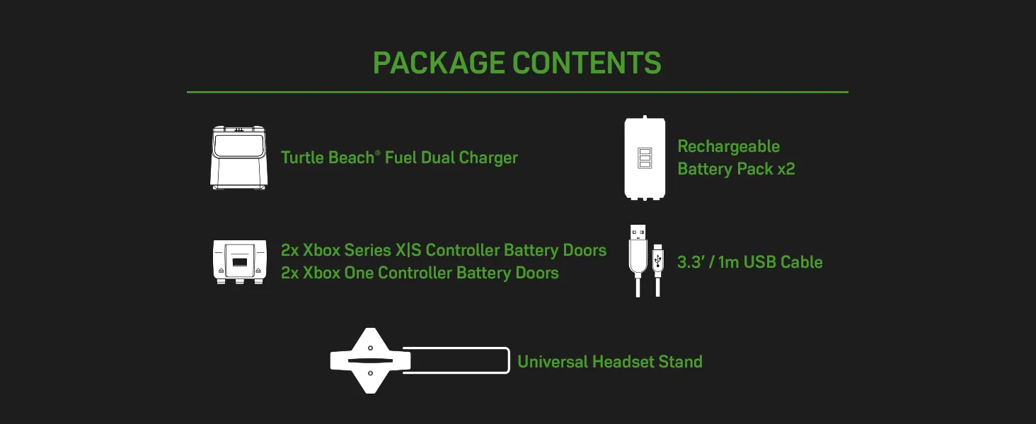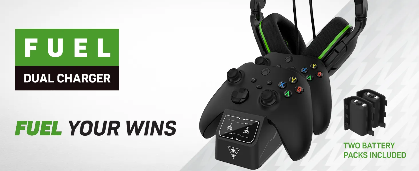 The Turtle Beach Fuel Dual Controller Charging Station & Headset Stand for Xbox Series X, Xbox Series S & Xbox One First-Party Wireless Controllers delivers reliable power for your controller and convenient headset storage. Two 1200mAh battery packs deliver 22+ hours of rechargeable power, plus you will never have to deal with the environmentally harmful, and frustrating AA batteries. When you do need to fuel up, simply drop your controller onto the charger, and in 2.5 hours you are back in action with a fully recharged battery. Keep an eye on the charge levels with easy-to-read battery level indicators, amber lights indicate the charge is in progress, and once the light turns white, you're good to go. The compact footprint of the station, and 3' / 1m cable length keeps your setup neat and manageable, regardless of where your gaming setup is located.