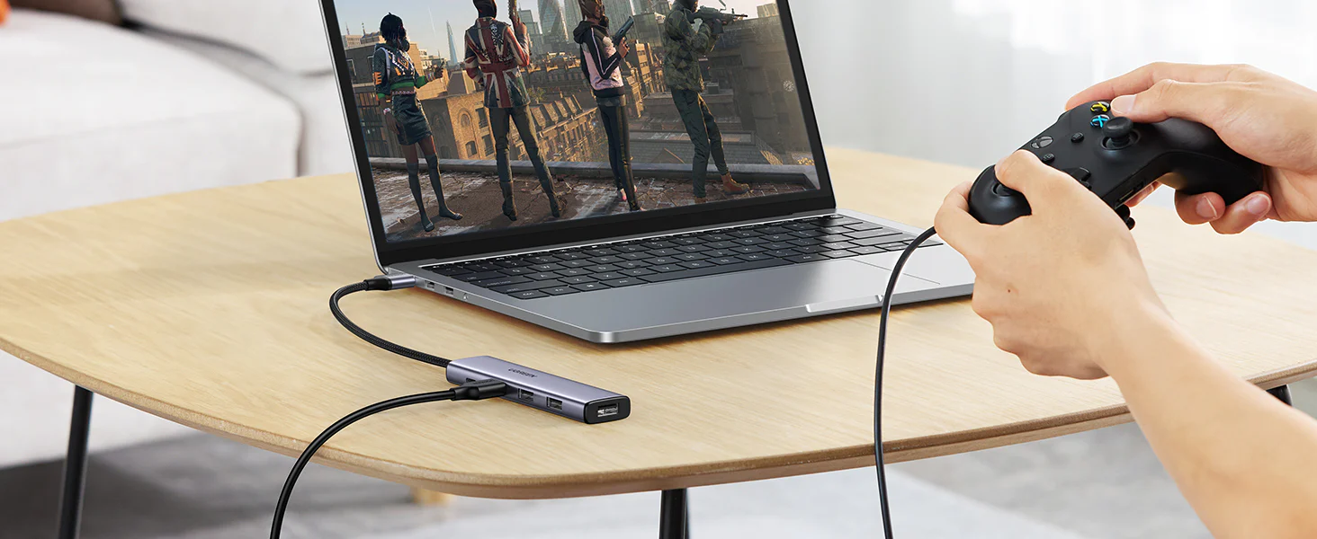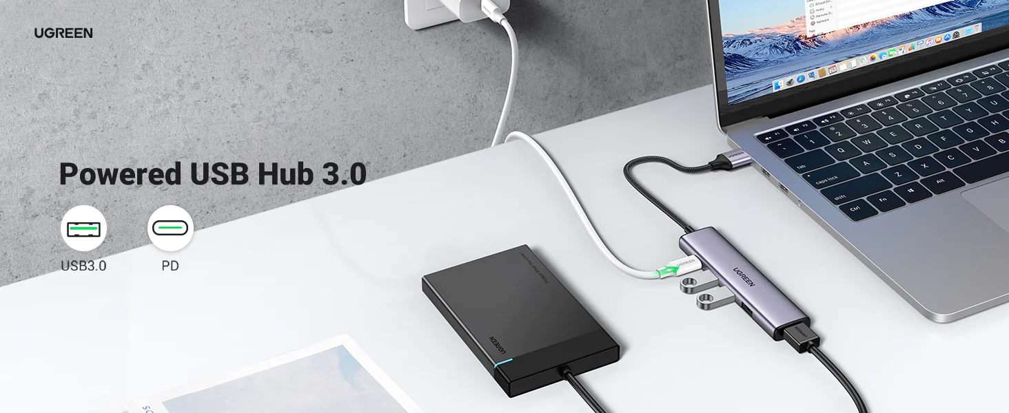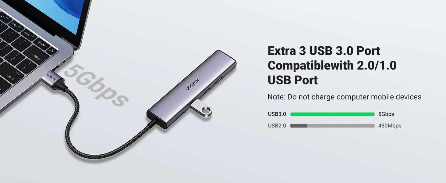 This USB 3.0 Hub for your laptop turns 1 USB port into 4 ports, Extra powered port support high-power equipment transfer stability