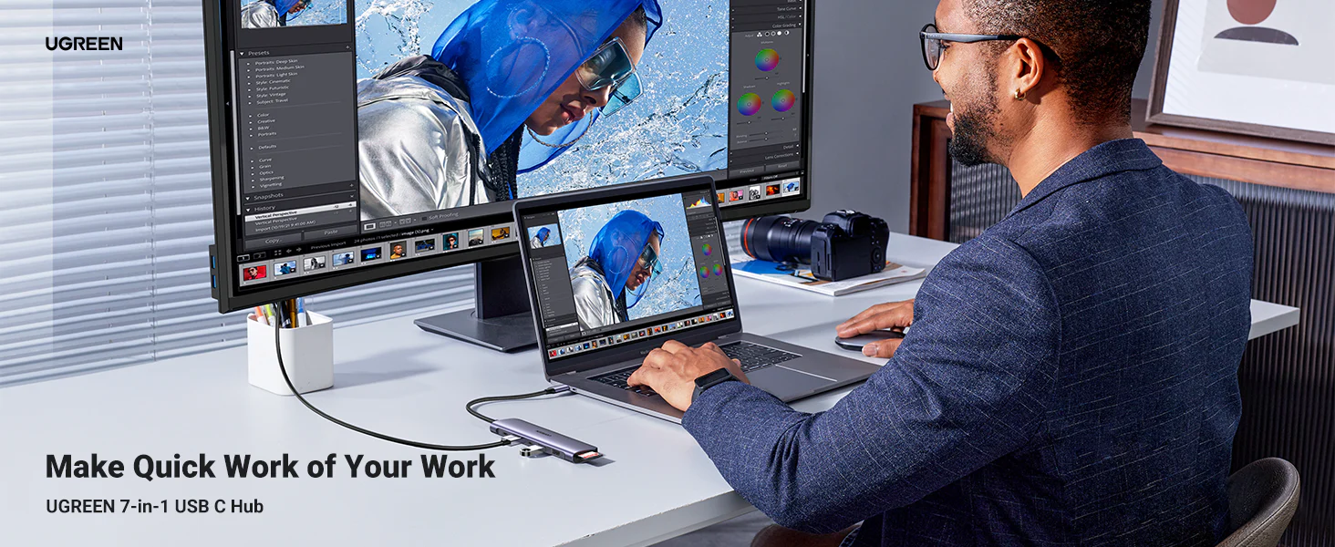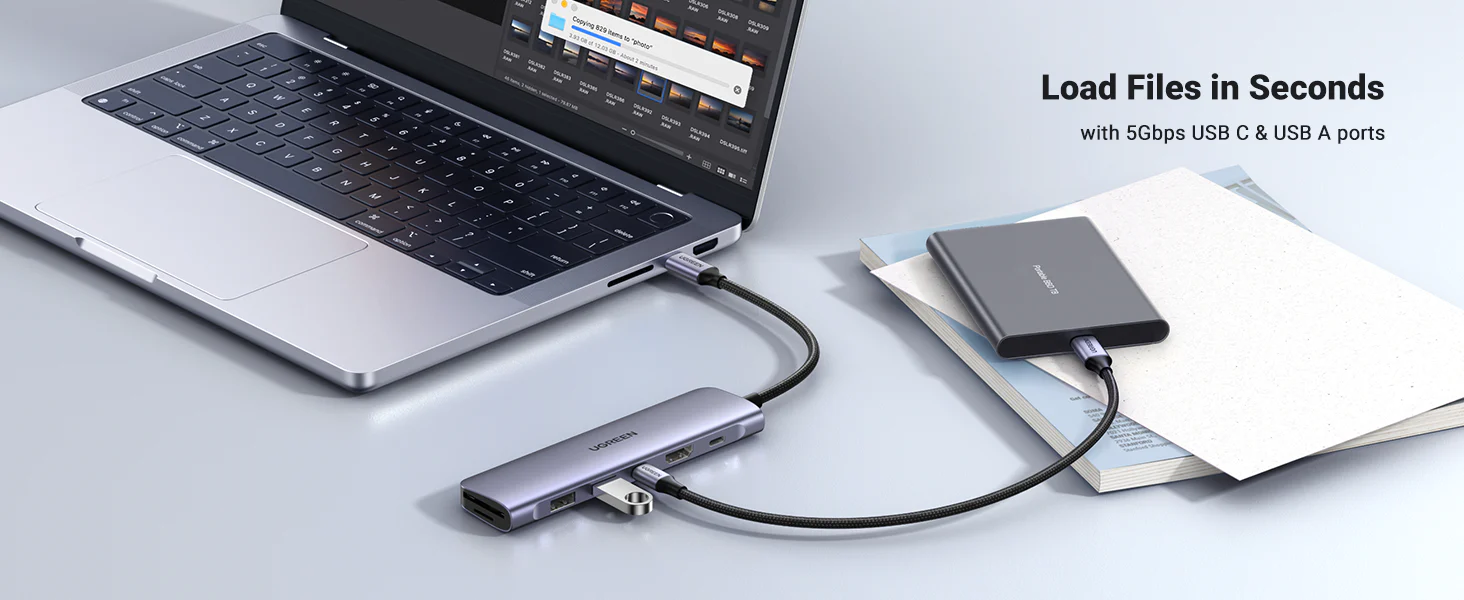 7-in-1 USB C Hub: Expand more ports to connect more. UGREEN 7-in-1 USB C to USB adapter features a 4K HDMI output port, SD and TF card readers, and 3 USB 3.0 ports. All hub ports can work simultaneously and save you the trouble of plugging & unplugging repeatedly. HDMI Port for 4K UHD Visual Feast: Mirror or extend your screen with UGREEN USB C to HDMI adapter to directly stream 4K UHD, Full HD 1080p, or 3D video to HDTV, monitor, or projector. You could not only enjoy movies with your family on a bigger screen, but also make a vivid presentation in a meeting. 5Gbps Superspeed Data Transfer: This USB C to USB adapter adds 3 extra USB 3.0 ports for connecting multiple USB peripheral devices such as flash drives, hard drives, keyboards, mice, printers, MP3 players and more.Supports super faster data transfer up to 5Gbps, which allows you to transfer HD movies or files in just seconds. Reading SD/TF Cards Simultaneously: Built-in SD and TF slots easily access files from universal SD card and Micro SD cards; Supports 2 cards reading simultaneously. With speeds up to 104MB/S, this USB C Hub easily transfers photos or videos from your camera' cards to the laptop in seconds, so you can see and share your photos anywhere and anytime. Compact and Easy to Use: Compact and lightweight, allows you to expand your laptop's capabilities while on the go. No need for a drive, just plug and play. Sleek Aluminum Design: UGREEN mac USB adapter is compatible with Mac and has a sleek aluminum finish perfectly complements Apple devices. The aluminum case is also better for heat dissipation, making this USB C adapter safer to use. Wide Compatibility: The usb c to usb adapter is compatible with almost USB-C devices such as MacBook Pro, MacBook Air, MacBook M1, M2, iMac, iPad Pro, Chromebook, Surface, Dell, HP, etc.