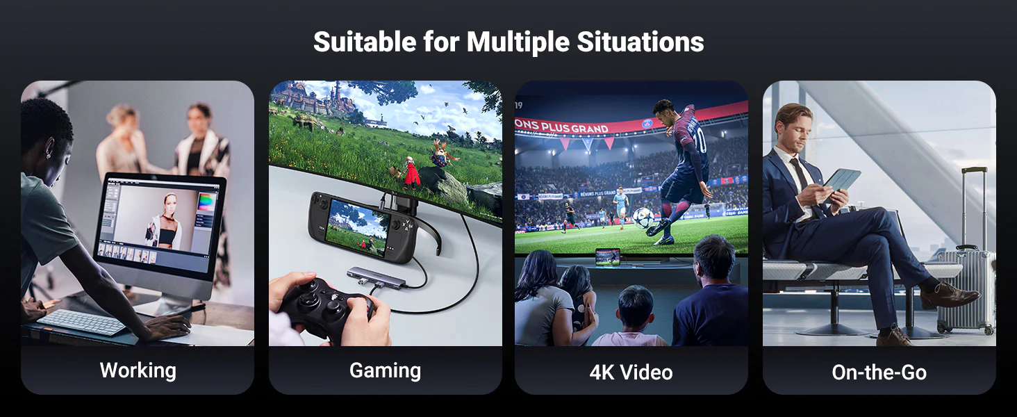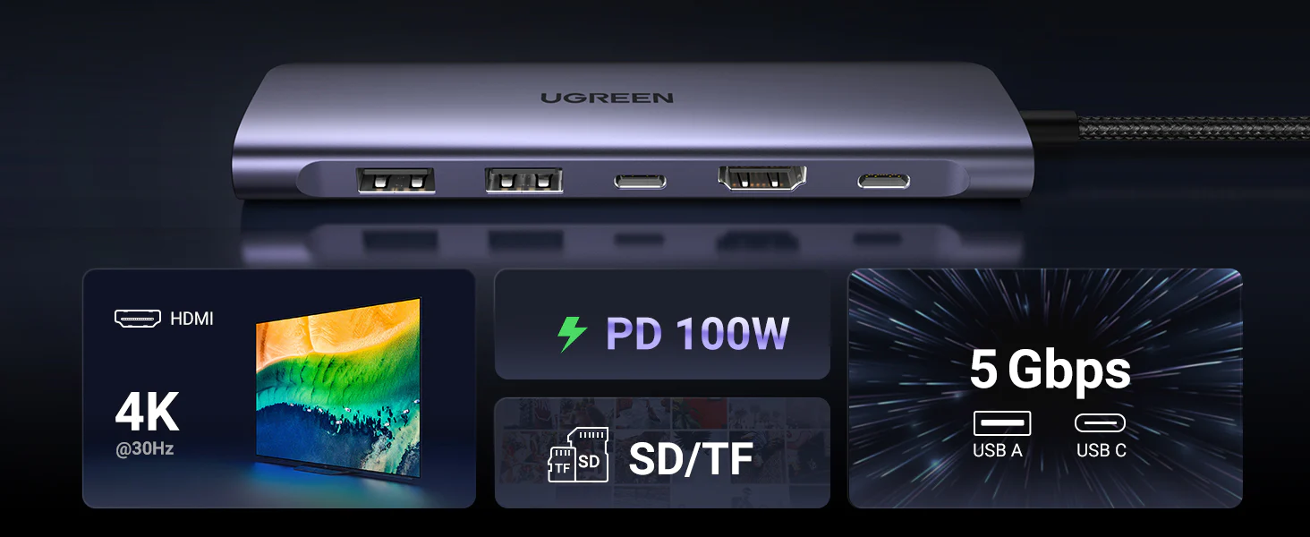 7-in-1 USB C Hub: Expand more ports to connect more. UGREEN 7-in-1 USB C to USB adapter features a 4K HDMI output port, SD and TF card readers, and 3 USB 3.0 ports. All hub ports can work simultaneously and save you the trouble of plugging & unplugging repeatedly.