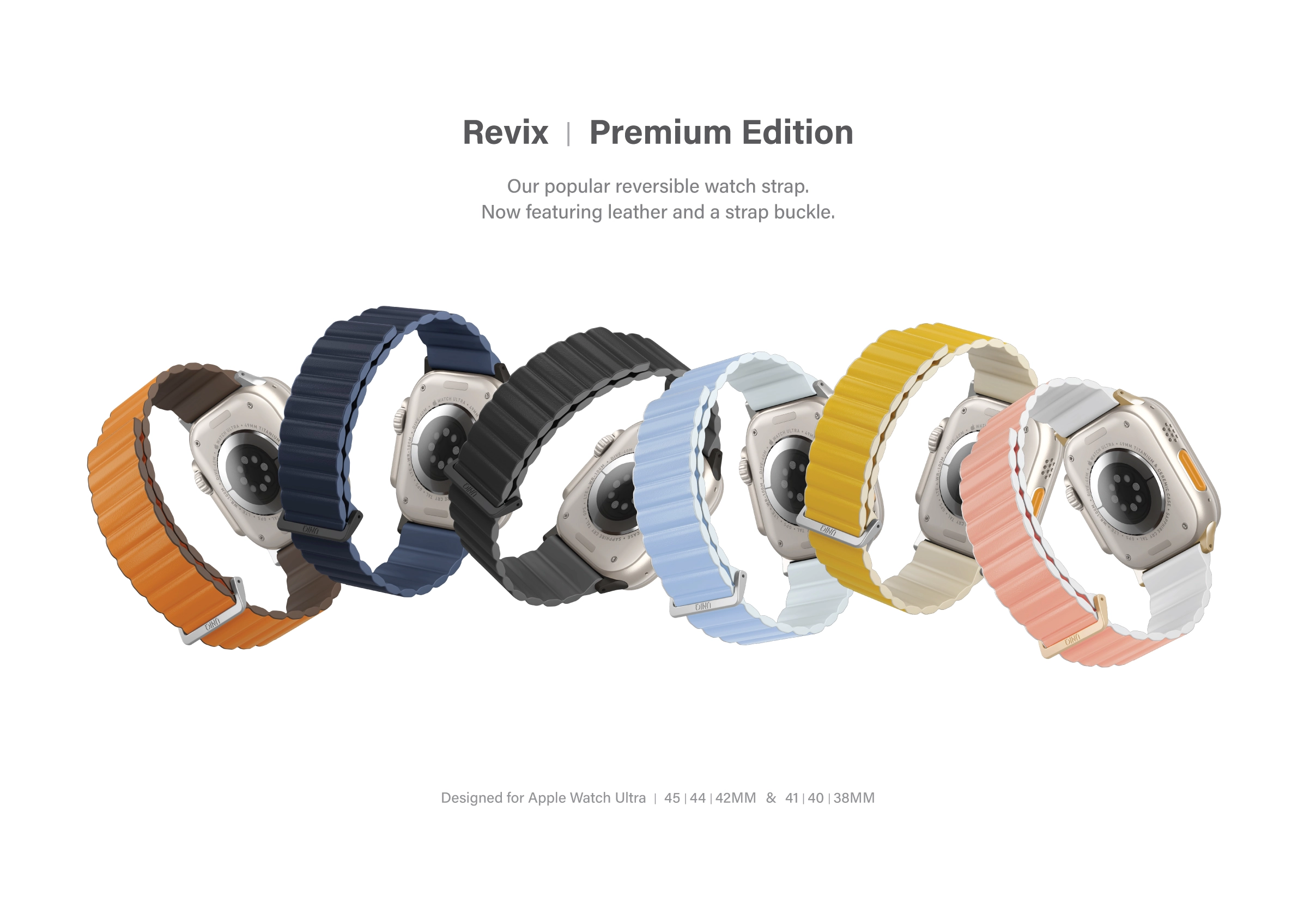 Go bold with Revix Premium Edition, a reversible dual-colored, dual-material strap that lets you switch up your style with just a flip. Featuring a reversible design with premium leather on one side and ultra-soft silicone with a smooth finish on the other. Improved with an additional metallic clasp, the Revix Premium Edition stays comfortable yet secure on your wrist all day.