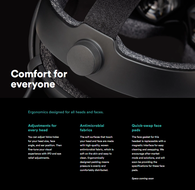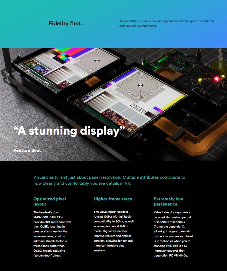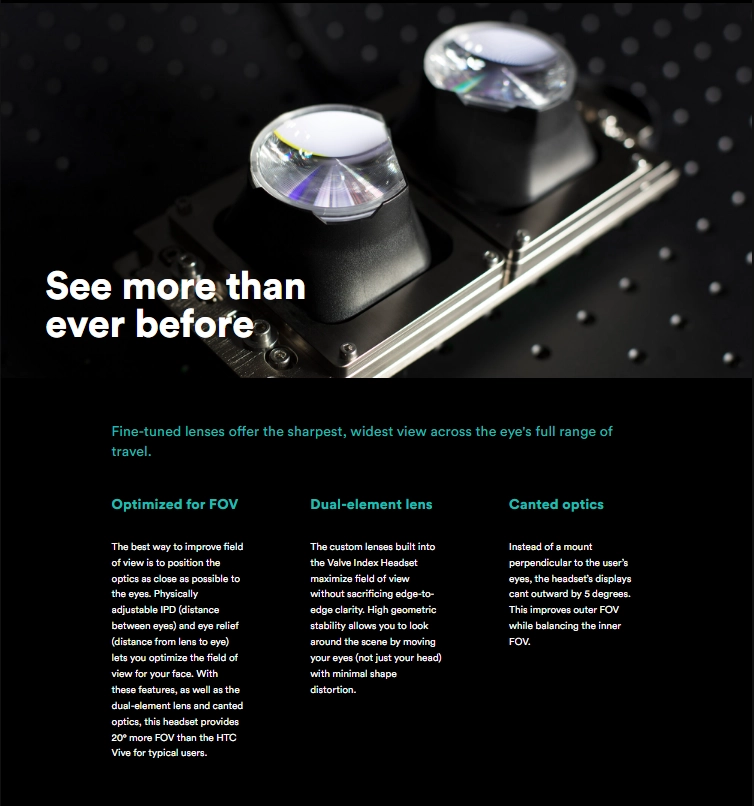 Display: The Valve Index features dual 1440x1600 RGB LCD screens, one for each eye, which provide a high-resolution visual experience with improved pixel density and reduced screen-door effect.