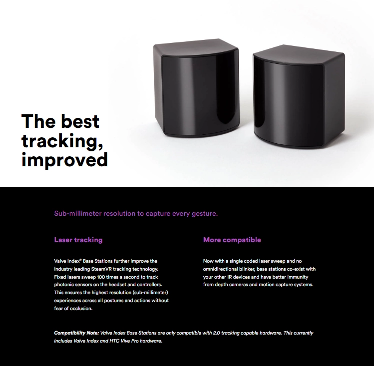 Base Stations: The Valve Index relies on external Base Stations for tracking. These Base Stations emit laser beams to track the position and movement of the headset and controllers in the physical space, allowing for accurate and low-latency tracking.