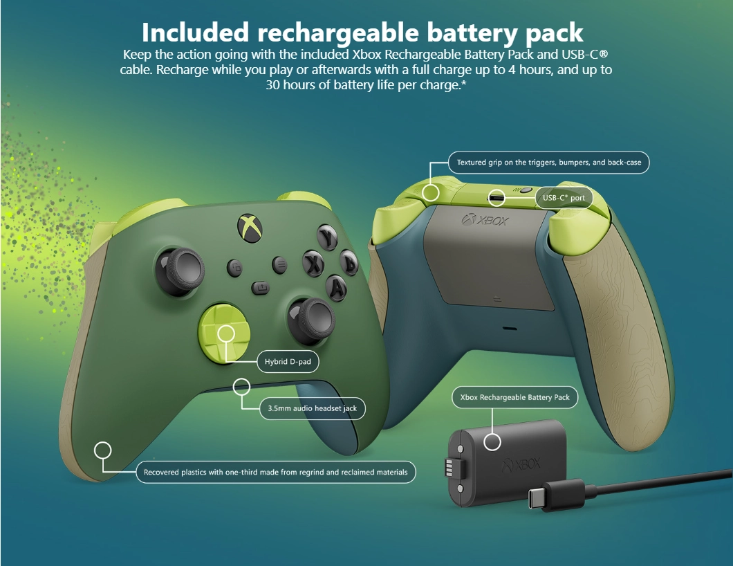 Experience the Xbox Wireless Controller – Remix Special Edition, featuring recovered plastics with one-third of it made from regrind and reclaimed materials. Also includes the Xbox Rechargeable Battery Pack that lets you play without using disposable batteries.