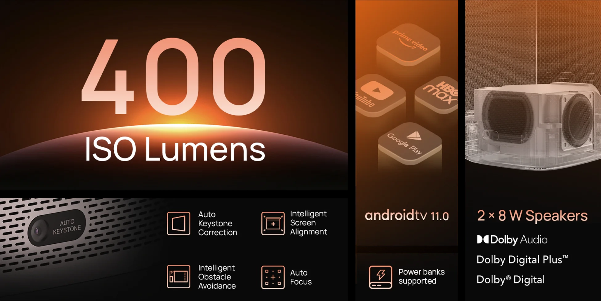 Cinematic Visuals for : MoGo 2's 400 ISO lumens, integrated D65 color temperature standard, and 90% DCI-P3 color gamut offer a cinematic big-screen experience with bright, colorful images.