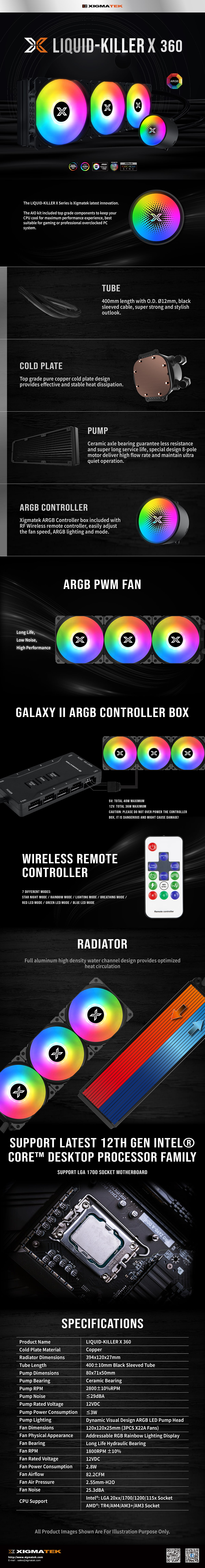Liquid Killer X 360 (AIO Liquid Cooler, New X logo ARGB Pump Head, 3x120mm ARGB Fan, Plastic Steel Backpanel)