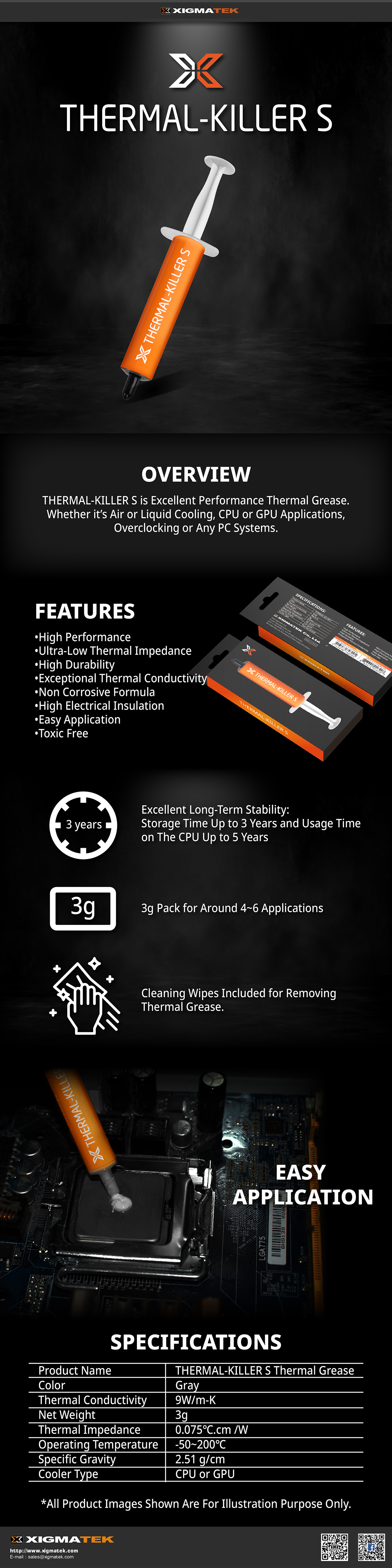 THERMAL-KILLER S is Excellent Performance Thermal Grease. Whether it’s Air or Liquid Cooling, CPU or GPU Applications, Overclocking or Any PC Systems.